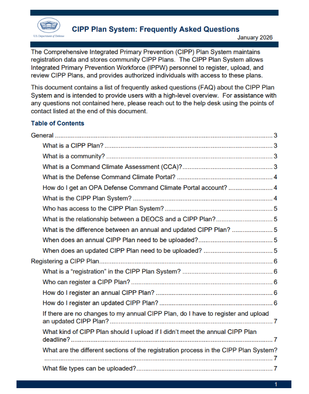 The Comprehensive Integrated Primary Prevention (CIPP) Plan System maintains registration data and stores community CIPP Plans in support of a Command Climate Assessment. The CIPP Plan System allows Integrated Primary Prevention Workforce (IPPW) personnel to create, update, and review CIPP Plans. Below are resources to assist with the CIPP Plan System within the Defense Command Climate Portal.