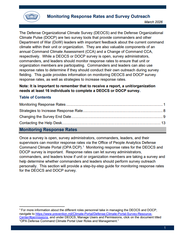 The Defense Organizational Climate Survey (DEOCS) and Defense Organizational Climate Pulse (DOCP) are Command Climate Assessment survey tools that provide commanders and Department of War (DoW) leaders with important feedback about the current command climate within their unit or organization. Resources for these surveys are located below.